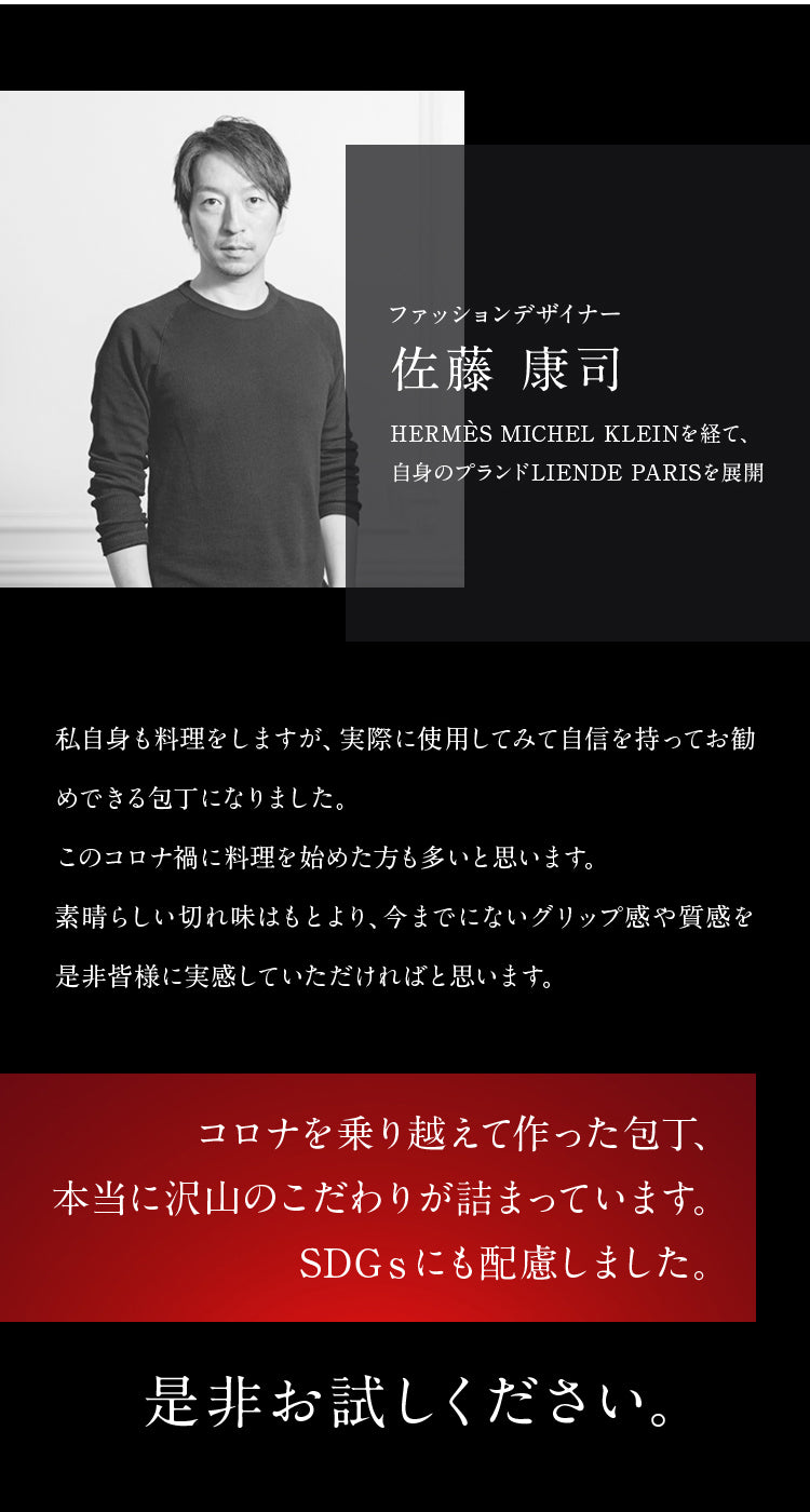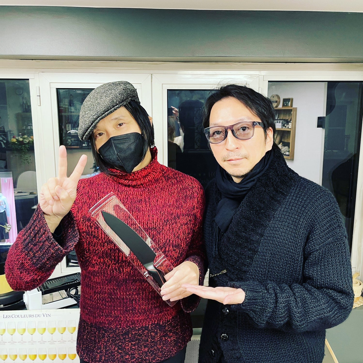 エルメスやミッシェルクラン等を手掛けたファッションデザイナー佐藤康司氏と、パリで一つ星を獲得した秋重信行シェフ(Automne)、同じく一つ星を獲得した中谷慎祐シェフ(Restaurant NAKATANI)と共に、シェフズナイフ(万能包丁)『Nu-E(ヌエ)』を完成させました。