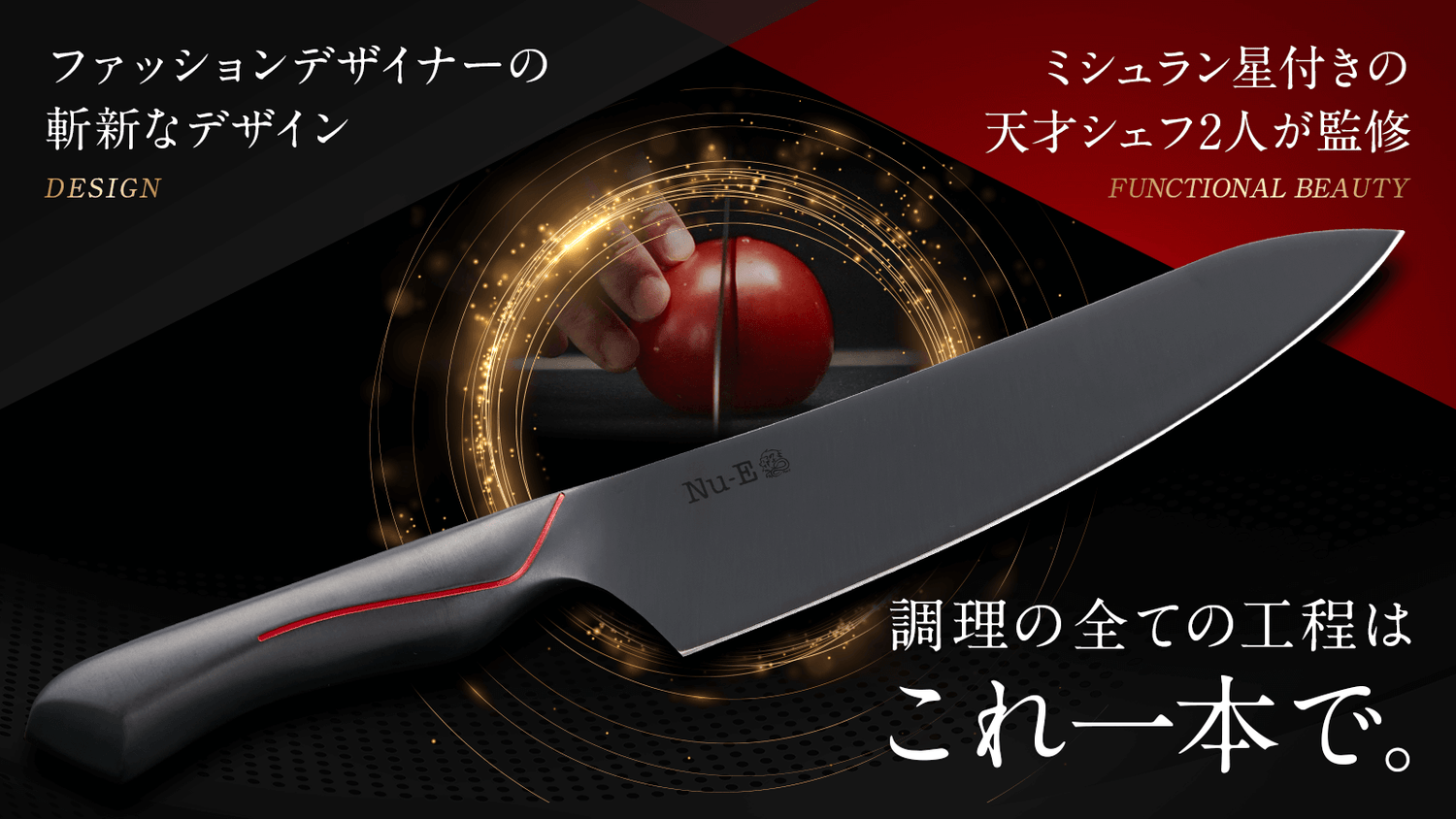 エルメスやミッシェルクラン等を手掛けたファッションデザイナー佐藤康司氏と、パリで一つ星を獲得した秋重信行シェフ(Automne)、同じく一つ星を獲得した中谷慎祐シェフ(Restaurant NAKATANI)と共に、シェフズナイフ(万能包丁)『Nu-E(ヌエ)』を完成させました。